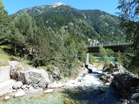 Cruzamos el puente y al lado hay un poste indicador. Nos señala hacia Conangles, giramos a la izquierda para buscar nuestro refugio. Creemos que está cerca pero son casi 2 kilómetros los que nos separan de la meta. Casi todos en llano y a cubierto del sol. Debemos atravesar un puente que aqui creo llaman Palanca y nos sirve para pasar sobre el río Besiberri sin mojarnos.