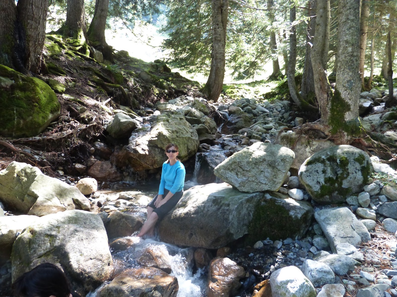 Vemos que el río fluye muy cerca y decidimos ir a buscar frescura a su orilla. Hacia la izquierda nos internamos en el inmenso bosque de abetos, con un tamaño colosal, encontramos un sitio ideal para comer y refrescar las piernas.